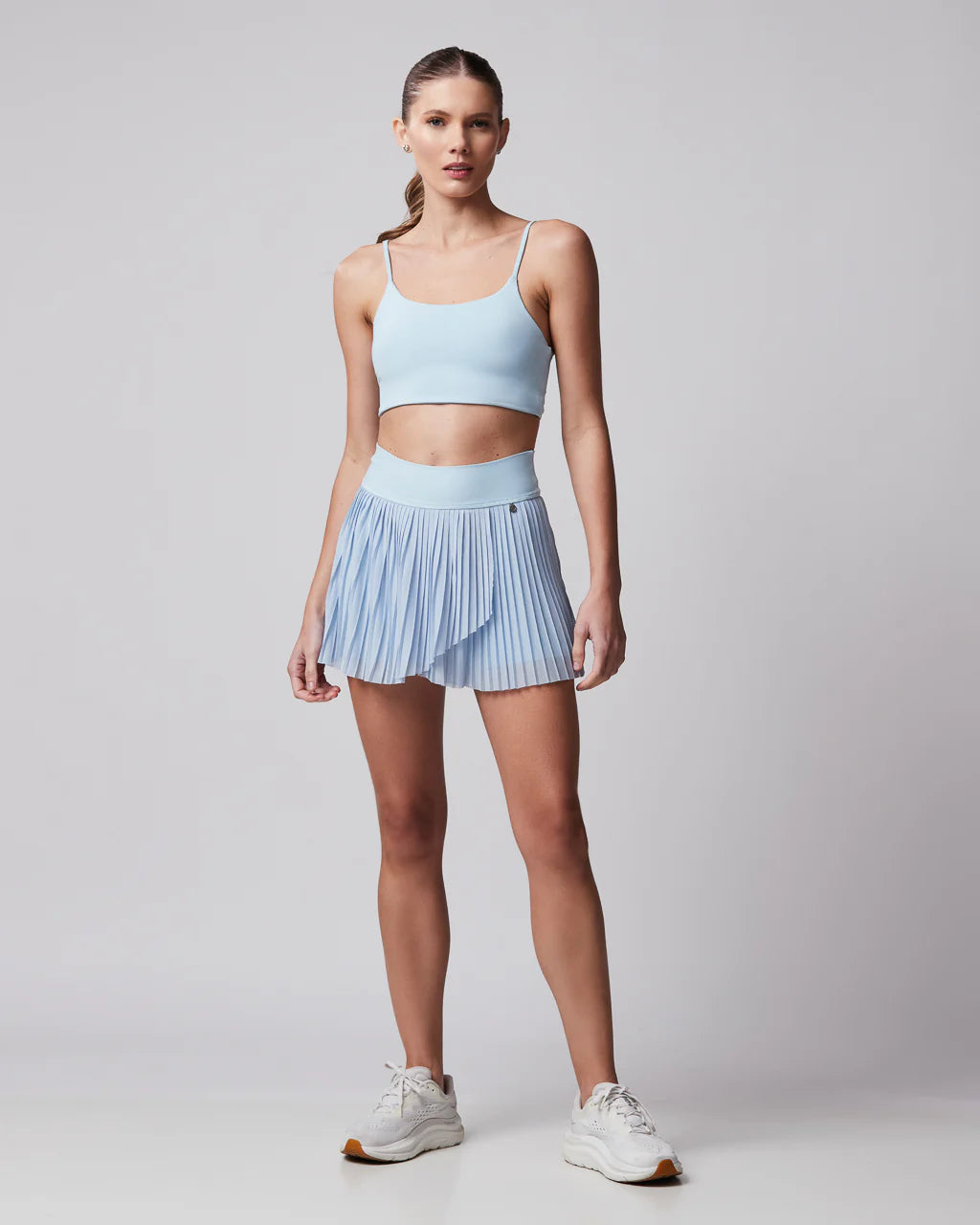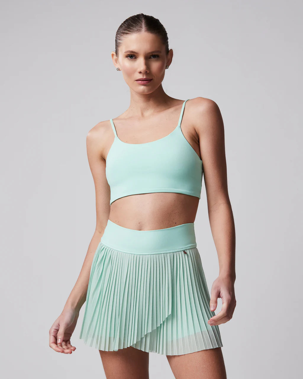 O detalhe plissado adiciona movimento ao look, enquanto o tecido com elasticidade e secagem rápida acompanha seu ritmo, seja nos treinos ou em momentos casuais.