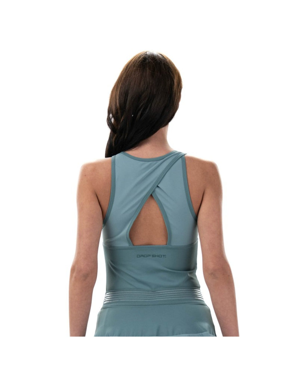 O grande diferencial está no recorte cruzado nas costas, que combina charme e frescor ao look esportivo. Para finalizar, o nome Drop Shot com acabamento espelhado traz um toque moderno e marcante à peça.